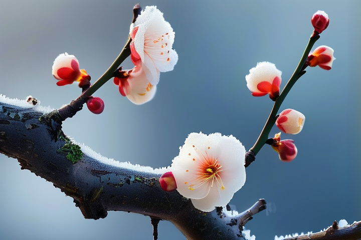 冬梅的花朵小巧玲珑,色彩斑斓,有的呈纯白色,有的带有淡淡的粉色或紫色,这些花朵通常成簇生长,密集排列在枝头,仿佛是冬天里的一抹温暖,冬梅的花瓣质地柔软,触感细腻,花香淡雅,给人一种清新脱俗的感觉。